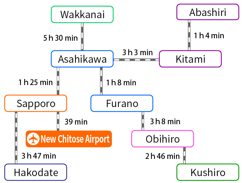 Railroads connect major cities in Hokkaido such as Sapporo, Hakodate, Asahikawa, Obihiro and Kushiro.