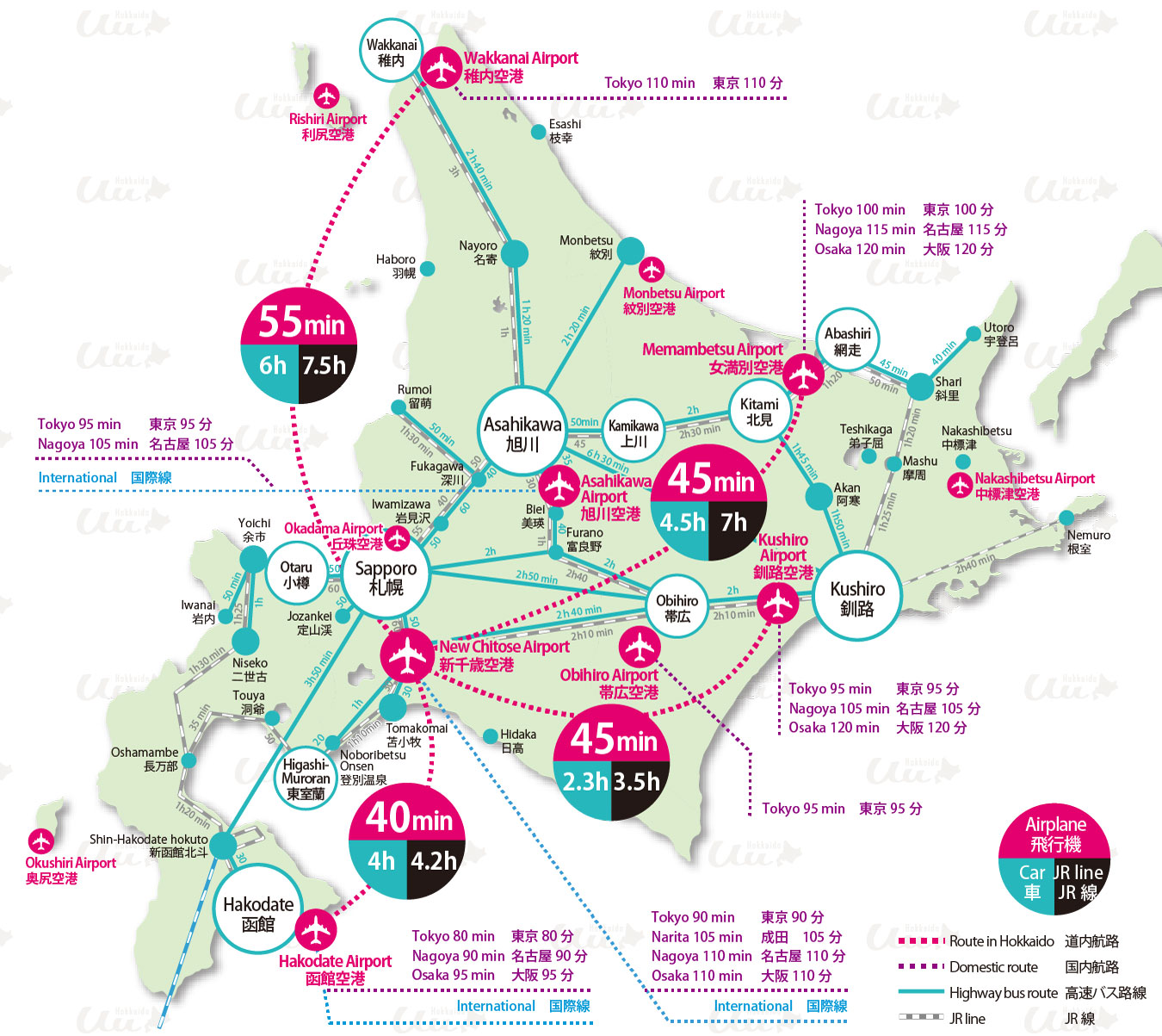 Wakkanai-Oshidomari: 2 to 4 flights/day (0 to 1 flight/day via Kafuka), 1h40min-1h50min