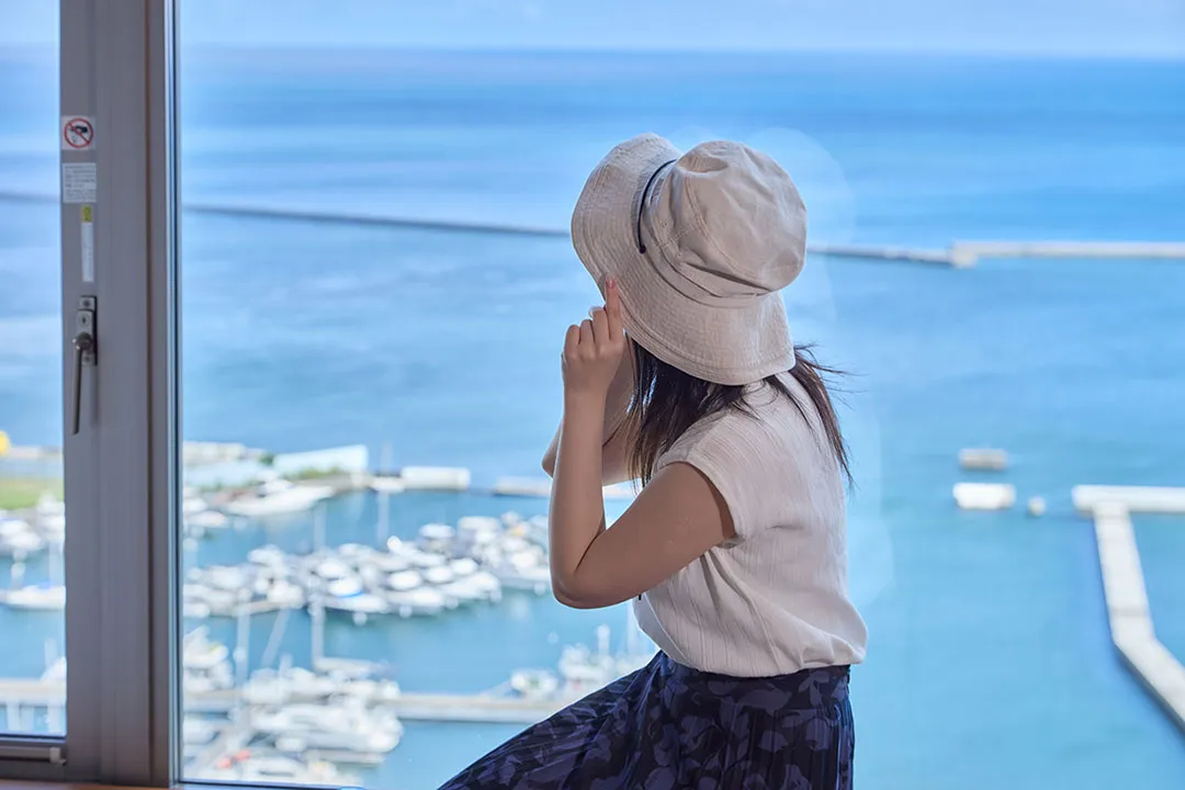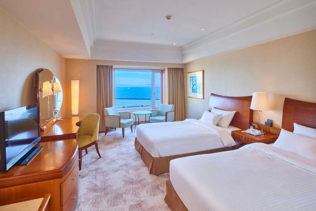 All rooms are over 32 square meters / Ocean View・Mountain View / 3 types of suites on the top floor / Japanese-style rooms / Direct access to commercial facilities / Safety box / In-room safe / Closet storage / Laundry service / Restaurant / Guest lounge (exclusive to guests staying in certain room types)/ Bar / Souvenir shop / Banquet and meeting rooms / Wedding facilities / Reservation privileges