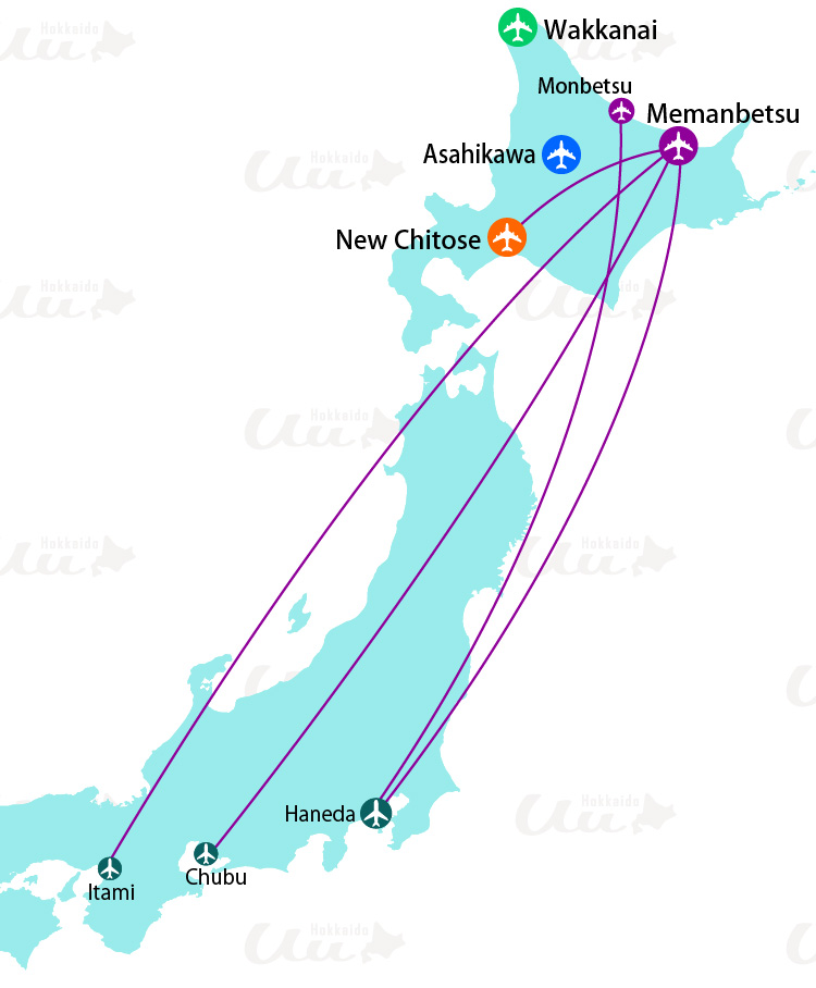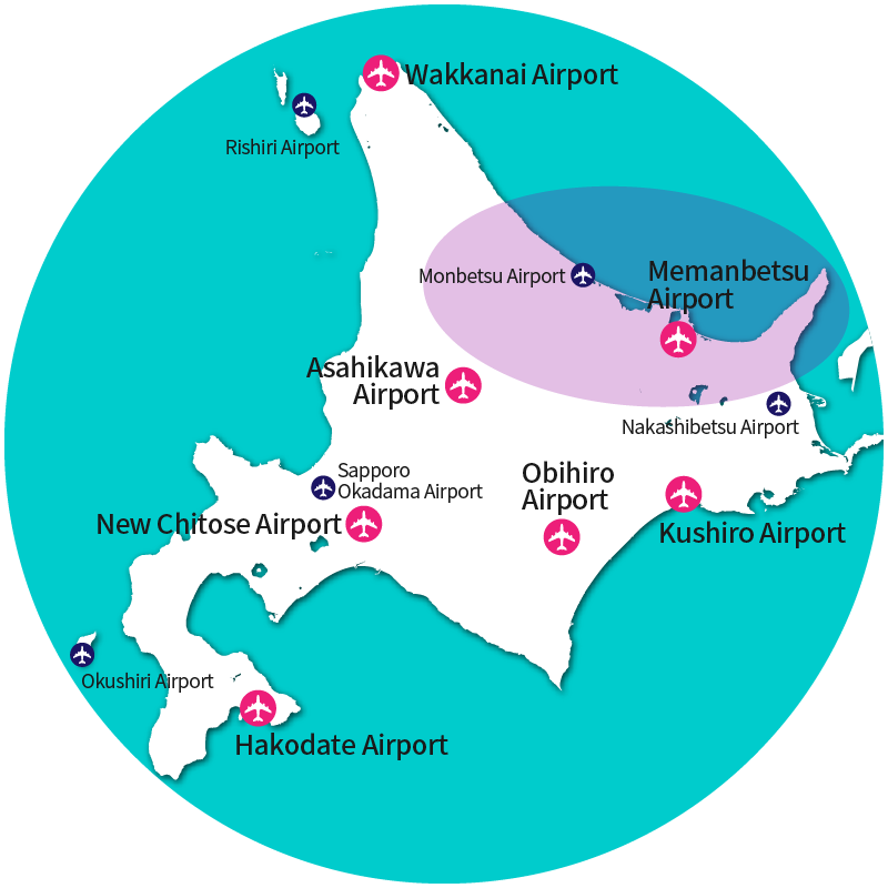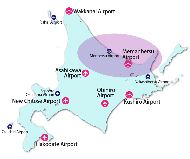 New Chitose Airport | Okadama Airport | Asahikawa Airport | Hakodate Airport | Okushiri Airport | Memanbetsu Airport | Monbetsu Airport | Kushiro Airport | Nakashibetsu Airport | Obihiro Airport | Wakkanai Airport | Rishiri Airport