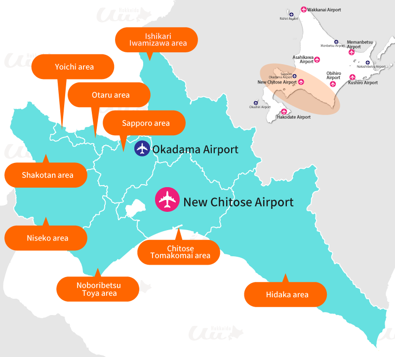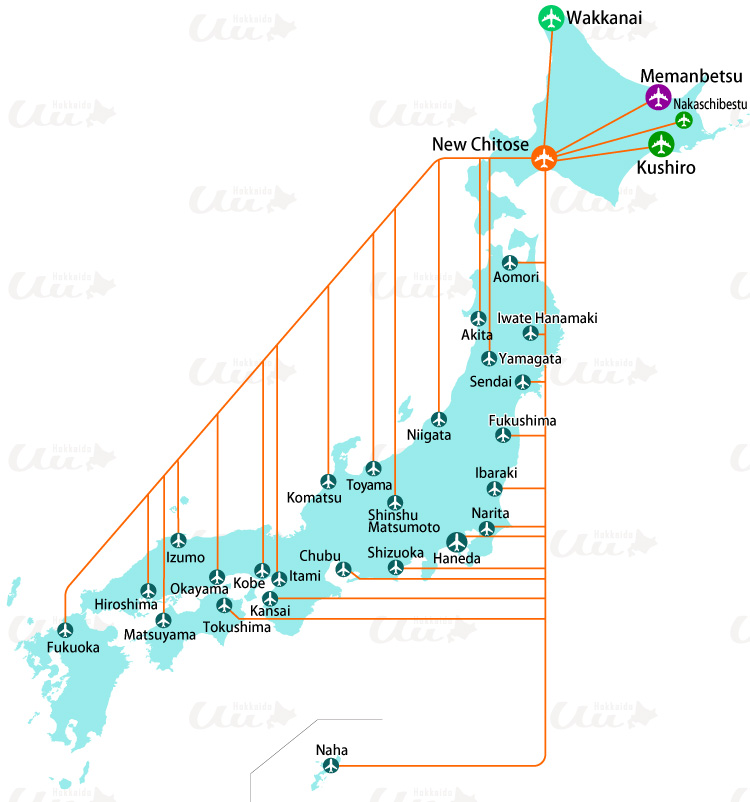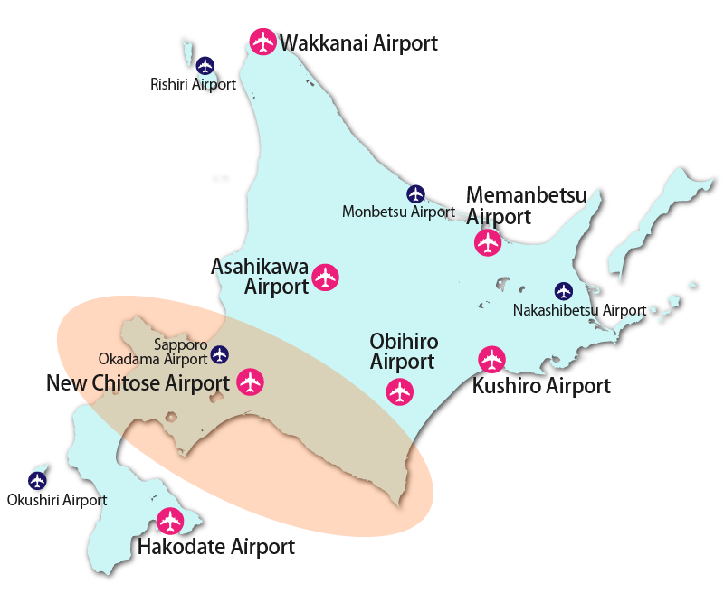 New Chitose Airport | Okadama Airport | Asahikawa Airport | Hakodate Airport | Okushiri Airport | Memanbetsu Airport | Monbetsu Airport | Kushiro Airport | Nakashibetsu Airport | Obihiro Airport | Wakkanai Airport | Rishiri Airport