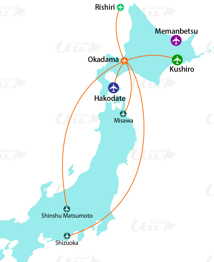 New Chitose Airport | Okadama Airport | Asahikawa Airport | Hakodate Airport | Okushiri Airport | Memanbetsu Airport | Monbetsu Airport | Kushiro Airport | Nakashibetsu Airport | Obihiro Airport | Wakkanai Airport | Rishiri Airport