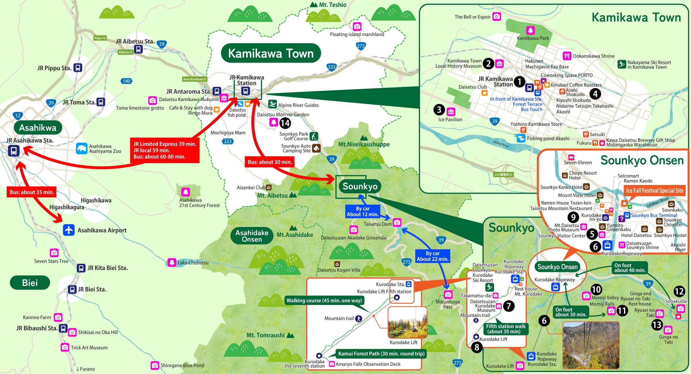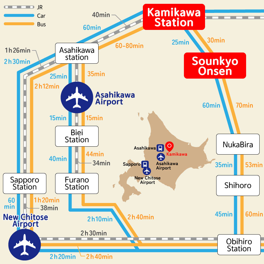 Bus: Take the 79-Asahikawa Airport Line (direct) to Asahikawa Station in about 35 minutes. From Asahikawa Station, take the 81-Souunkyo Line to Souunkyo in about 2 hours.