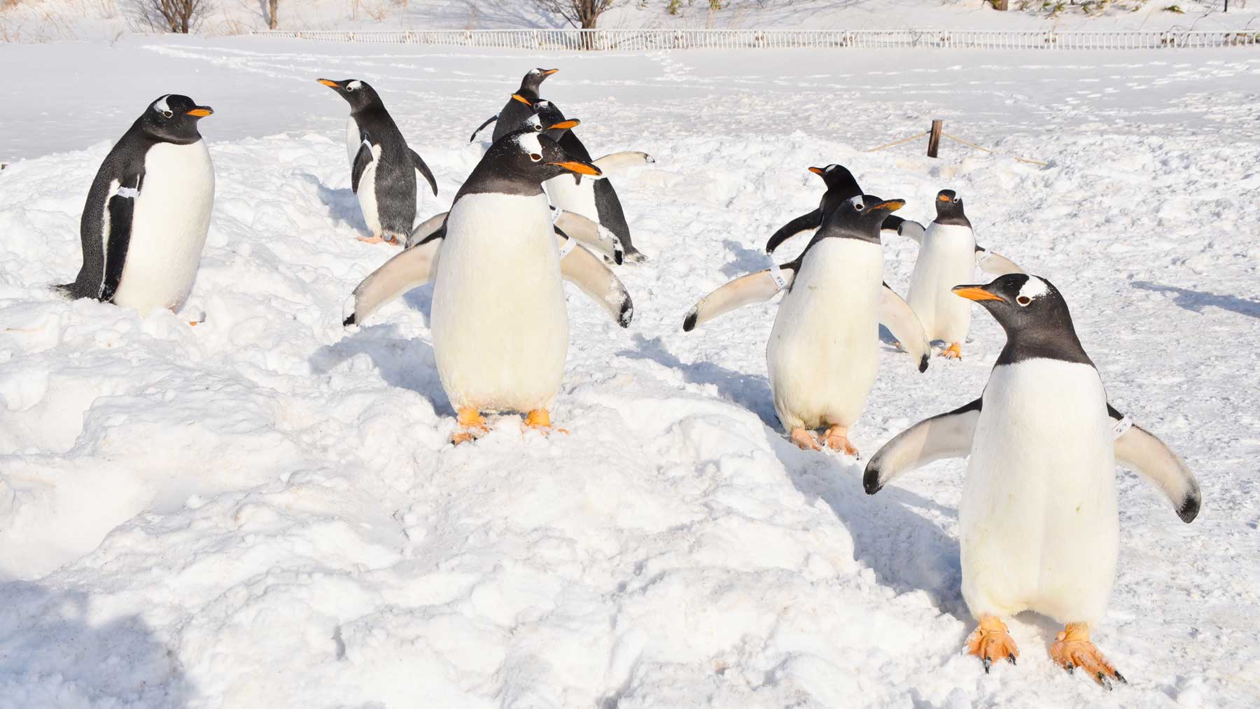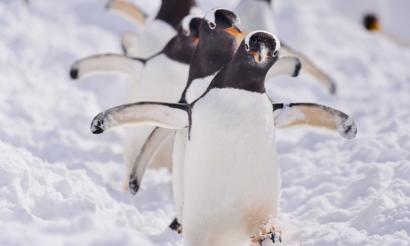 During the season, Gentoo penguins will take walks on the snow (or on the grass before snowfall) four times a day.