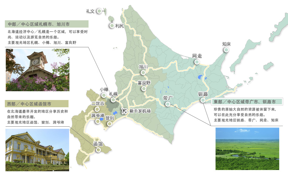从整个亚洲来看,如果把北海道用亚洲最东边的岛,或日本最北边的岛来形容的话,地位位置是非常易懂的,同样像悠悠北海道图中所示,将北海道按照(北海道西部、中部、东部)的区域划分后来介绍。